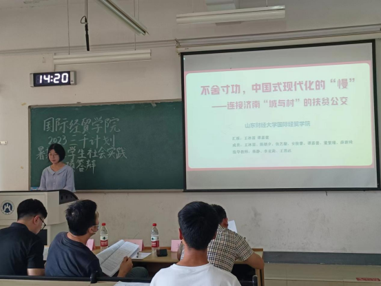 本次答辩共分为课题展示和评委提问两大部分。每支答辩队伍各有4分钟的陈述时间,3分钟提问答辩。答辩开始,各队代表按照预先排好的答辩顺序,以PPT的形式向在场的评委展开了精彩纷呈的答辩。他们聚焦当今社会存在的突出问题,针对新时代农村、企业、社区三大领域中的热点深入挖掘,展现了对社会民生的深入思考,并陈述已经取得的成果和下一步调研计划。