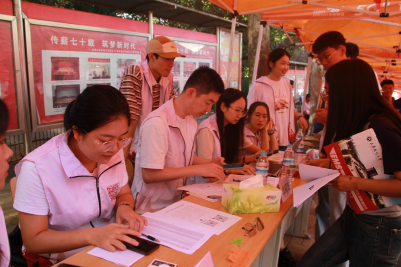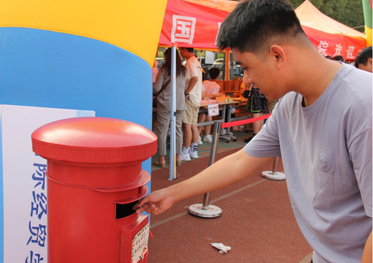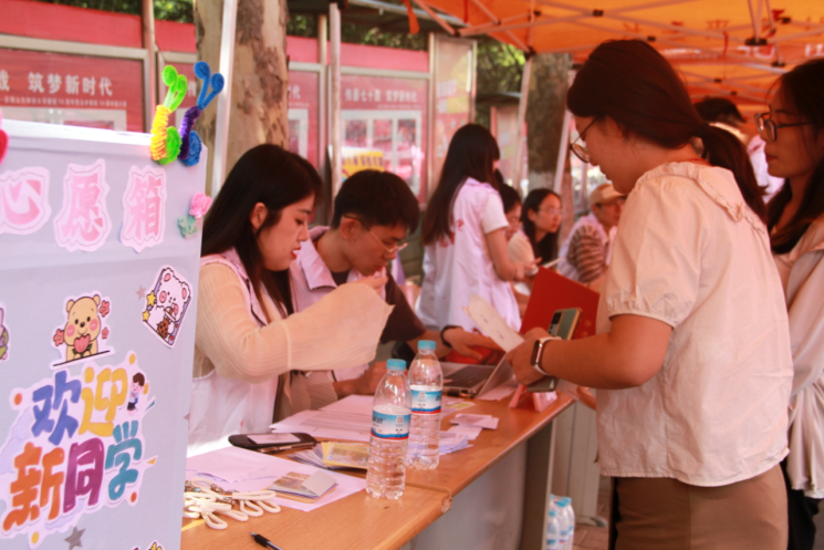 在迎新现场,陆续到达的新同学们受到学长学姐们的热情迎接,感受到学院大家庭的温暖。迎新现场,虽然已是9月,但天气依旧炎热,而志愿者们不惧炎热的天气,有条不紊地帮助新生办理入学手续。他们有的在迎新点处统计基本信息、发放新生礼包,有的帮助新生将行李运往宿舍,用心周到的服务让新同学们倍感亲切。学院特意为新生准备了“时光邮筒”“心愿箱”,引导新同学在迎新现场写下自己的美好心愿。另外,迎新点附近的展板则为新生们详细地介绍了学院概况、团队建设、联系我们、毕业生去向等内容,让他们对学院和所学专业有着进一步了解。此外,学院还为新生精心设计了T恤、卡套、贴纸等文创礼物,让新生切身感受到学院的关爱和文化风采。