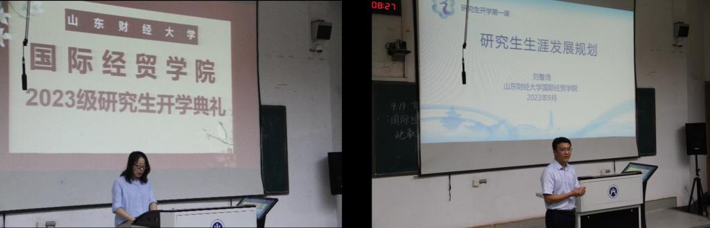 典礼结束后,分管学院研究生工作的副经理刘鲁浩教授给同学们上了开学第一课,主要介绍了国际经贸领域涉及的研究话题、硕博招生专业情况、研究生生涯的过程、学位论文的流程并为研究生们提供了发展规划建议,为研究生的学业规划指明了方向。