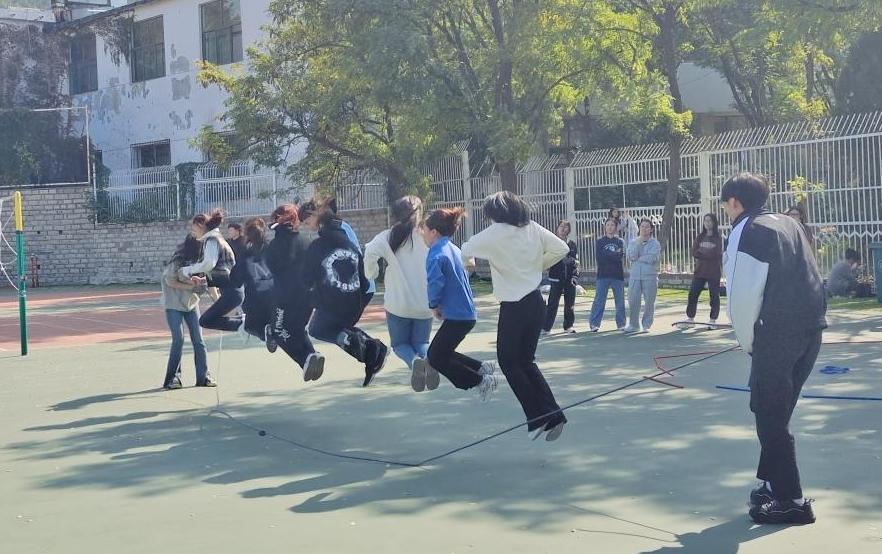 第三部分内容包括四个项目:“2+8”跳绳、“不倒森林”“激情穿越”和“喊响口号”。三个团队同时比赛,完成所有项目用时最少的队伍获胜。每个同学都是项目中不可或缺的一部分,极大地锻炼了大家的合作能力、团队意识。其中,“2+8”跳绳考验大家的默契程度;“不倒森林”需要每个同学都全神贯注,兼顾左右同学,确保接住细杆;“激情穿越”需要同学们集思广益,一起思考通关用时最短的方法;在“喊响口号”的活动过程中,大家通过一系列动作逐字喊出“我们是最棒的团队”,增强了团队信心。