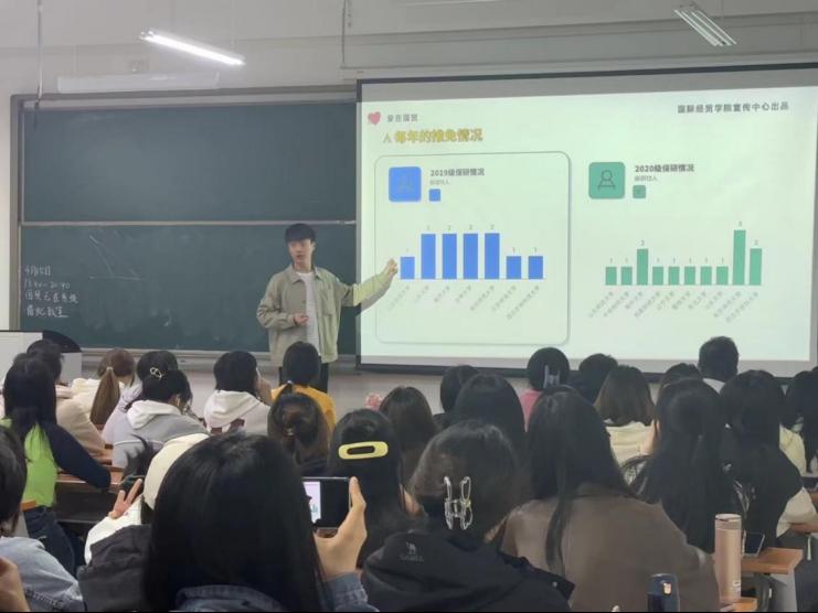 为进一步推进公司学风建设,引导广大同学科学合理规划学业与职业发展,4月16日,公司在圣井校区举办了以“国贸考研大数据”为主题的考研经验分享会,本次活动由学院2023届毕业班辅导员主讲。