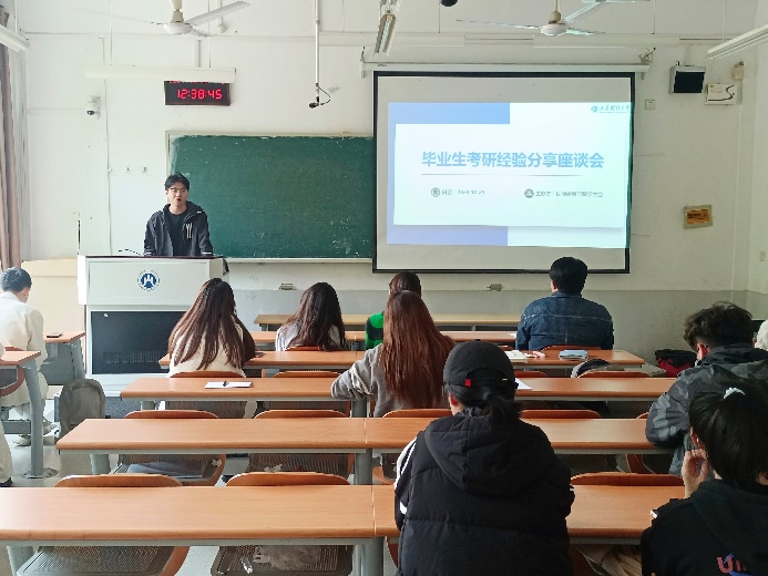 张皓天学长首先对考研科目的学习经验进行分享,分别从政治、英语、数学、专业课提出了针对性的建议,如:政治需结合题目与知识点进行选择题练习,从错题补充薄弱知识点;英语需每日坚持做真题阅读,以培养“手感”;数学则需重视对知识点的深入理解,而非单纯追求做题速度;专业课可以在复习过程中使用思维导图,形成自己的知识体系等。最后张皓天同学鼓励大家在追求目标的过程中,需坚定信念,持续做好自己应做的事。