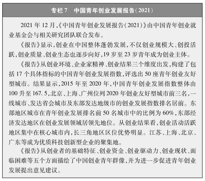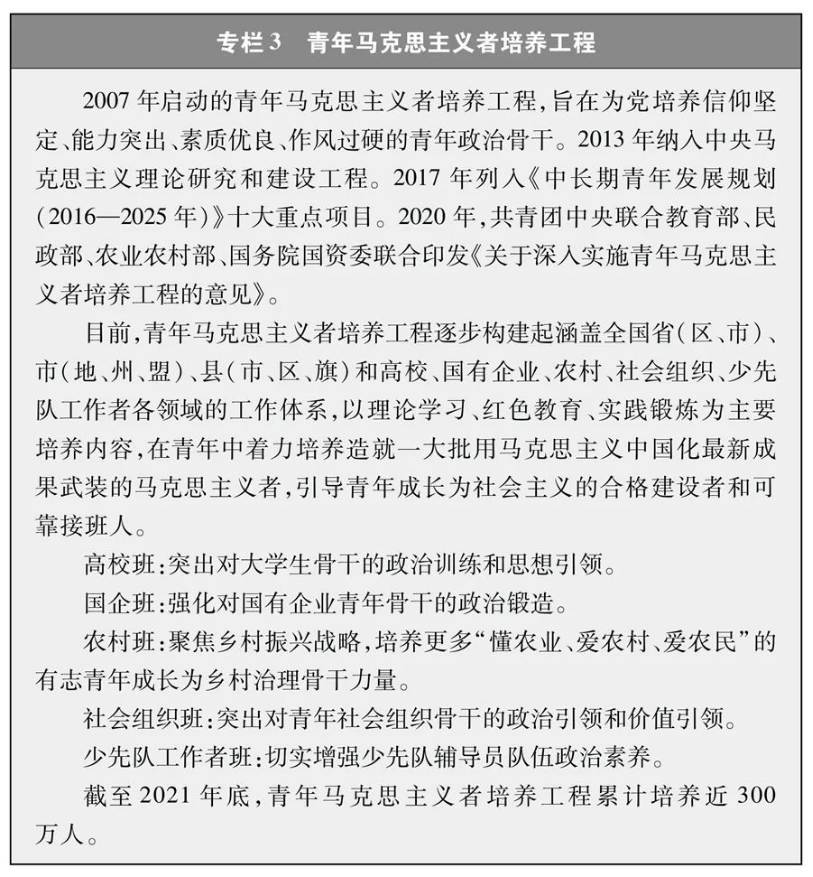 政策保障日益完备。针对中国青年多元化发展需求,国家强化政策服务导向,健全完善政策体系。国民经济和社会发展“十三五”和“十四五”规划鲜明体现青年元素,科教兴国、人才强国、创新驱动发展、乡村振兴、健康中国等国家重大战略充分关注青年群体,青年发展得到越来越多的顶层设计支持。2017年4月,中共中央、国务院制定出台新中国历史上第一个国家级青年领域专项规划——《中长期青年发展规划(2016-2025年)》,为新时代中国青年发展提供根本政策指引。针对青年在毕业求职、创新创业、社会融入、婚恋交友、老人赡养、子女教育等方面的操心事、烦心事,党和政府高度重视,各项政策举措持续出台,青年发展型城市建设蓬勃开展,青年优先发展理念日益深入人心。目前,从中央到地方的青年工作机制基本建成,具有中国特色的青年发展政策体系初步形成。青年充分享受政策红利,实实在在感受到关爱就在身边、关怀就在眼前。