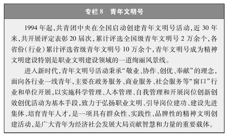 新时代中国青年顺应社会发展潮流,适应国家治理体系和治理能力现代化要求,在社会文明建设中引领时代新风,争当正能量的倡导者、新风尚的践行者。 无论在城镇还是乡村、企业还是学校,青年都自觉把正确的道德认知、自觉的道德养成、积极的道德实践紧密结合起来,带头倡导向上向善社会风气、塑造社会文明新风尚。在城乡社区建设中,越来越多的青年投身社区治理和服务体系建设,主动参加“社区青春行动”,加强实践锻炼、提升服务贡献。在各行各业,青年秉承“敬业、协作、创优、奉献”的理念,踊跃创建“青年文明号”,大力弘扬新时代职业文明,展现新时代职业形象。广大青年运动员弘扬体育道德风尚,以良好的赛风赛纪和文明礼仪,获得竞技成绩和精神文明双丰收。1993年“中国青年志愿者行动”启动以来,志愿服务成为青年参与社会治理、履行社会责任的一面旗帜,成为青年在奉献人民、服务社会中锻炼成长的重要途径。截至2021年底,全国志愿服务信息系统中14岁至35岁的注册志愿者已超过9000万人,他们活跃在社区建设、大型赛事、环境保护、扶贫开发、卫生健康、应急救援、文化传承等各个领域,弘扬“奉献、友爱、互助、进步”的志愿精神,在全社会形成团结互助、平等友爱、共同前进的新风尚。中国青年志愿者扶贫接力计划研究生支教团、老员工志愿服务“西部计划”连续18年派遣41万余名研究生、大学毕业生,到中西部2100多个县(市区旗)开展扶贫支教、卫生医疗等志愿服务。青年始终是大型赛会志愿服务的主体力量,给千家万户乃至全世界留下深刻印象。
