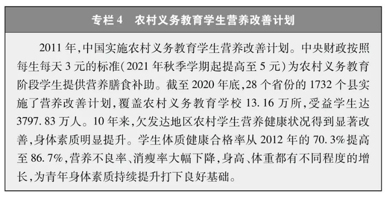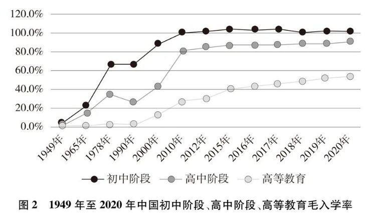 教育机会更加均等。中国教育事业优先发展不断深化,中国青年享有更加平等、更高质量的教育机会。2021年,中国义务教育巩固率达95.4%;高中阶段毛入学率达91.4%;高等教育毛入学率达57.8%、在学总规模达4430万人,居世界第一,越来越多的青年打开了通往成功成才大门的重要路径。覆盖学前教育至研究生教育的员工资助政策体系建成且日趋完善,2020年资助资金总额超过2400亿元、资助员工近1.5亿人次,实现“三个全覆盖”②。义务教育阶段进城务工人员随迁子女、农村和贫困地区员工等群体受教育权益得到充分保障。2020年,85.8%的进城务工人员随迁子女在公办学校就读或享受政府购买学位服务;2012年至2021年,农村和贫困地区重点高校专项招生计划定向招生超过82万人,让更多的青年公平享有接受更好教育的机会,阻断贫困的代际传递。