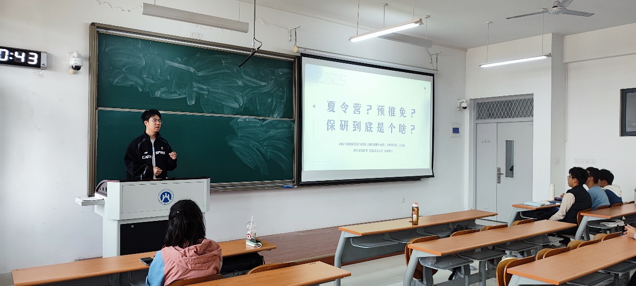 王钰骏同学作为国际发展合作创新班的班长,不仅在学业上取得了优异的成绩,还成功跨专业保研到了西南政法大学的法律硕士专业。他结合自己的学习经历,为新生们详细介绍了保研的准备工作和注意事项,包括如何选择合适的保研方向、如何制定科学的学习计划、如何参加科研项目和学术竞赛等。同时,他还分享了老员工活中的点滴经验,鼓励新生们要珍惜大学时光,积极参加各类活动和社团,拓展自己的兴趣爱好和社交圈子。