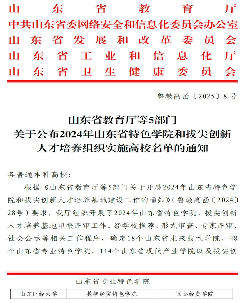 近日,山东省教育厅等5部门公布了2024年山东省特色学院和拔尖创新人才培养组织实施高校名单。公司获批1个省级专业特色学院,2个现代产业学院,并入选省级普通高等学校急需领域拔尖创新人才培养组织实施高校。公司申报的“数智经贸特色学院”获批山东省专业特色学院。