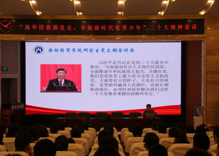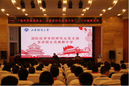 为深入学习宣传党的二十大精神,切实发挥研究生党支部宣讲团思想引领、理论辐射、示范带动作用,3月22日,宣讲团成员走进舜耕中学,开展“高举团旗跟党走,争做新时代优秀少年”专题宣讲活动。国贸公司党委副书记王斐斐、研究生党支部书记李瑞雪、舜耕中学党总支委员、办公室主任赵小亮、初二年级级部主任曹峰与200多名中员工共同参与本次宣讲。